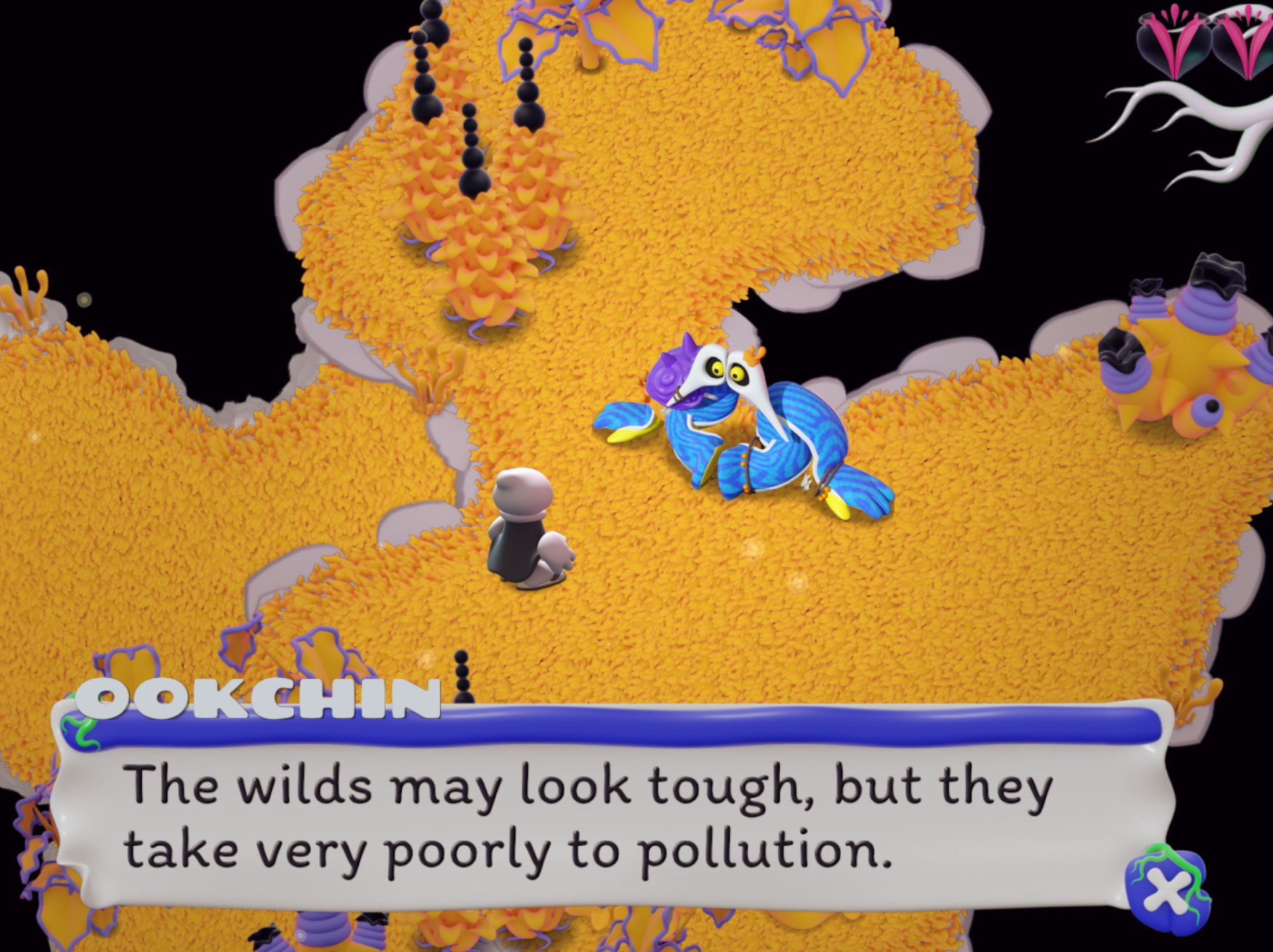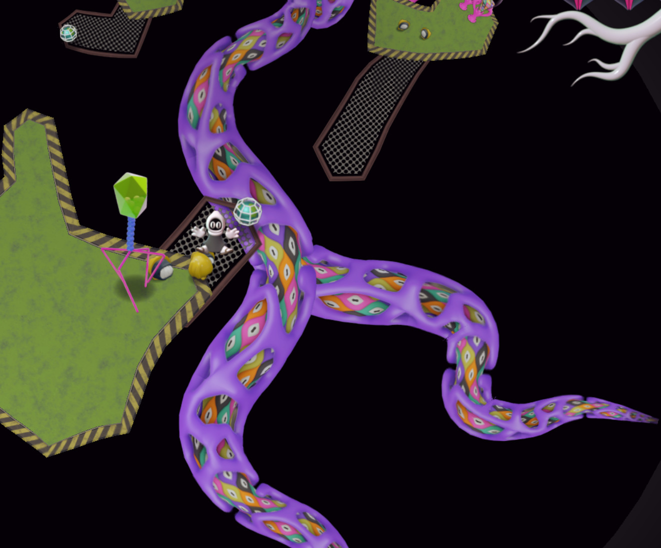 Innards is an action game set in hyperbolic geometry and employing pre-rendered graphics. I'm developing it solo, it is my latest passion project. I don't care about money nor acclaim anymore, so this game is and will remain 100% free. I also intend to keep it as unconventional, disorienting, and confusing as it currently is, if not more. I've began working on it while sick with cancer; it is the culmination (not termination, hopefully) of all my scattered threads of thought on math, metaphysics, regular physics, spirituality, biology, psychology. Nothing better embodies my distorted vision of the world than hyperbolic geometry - brain folds are hyperbolic, color spaces are hyperbolic, language is hyperbolic. Moreover, it's an experiment in a unique art-style (pre-rendered clay-like 3d graphics), in programming a game engine and toolings for real time hyperbolic gaming, in designing a large interconnected world within that very alien non-Euclidean space, in designing writing characters (an absolute pleasure), in music-making.